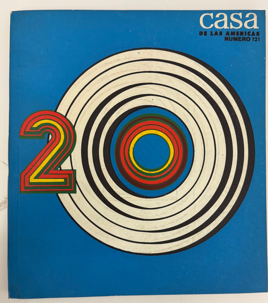 This commemorative issue of Casa de las Américas (Number 121, July-August 1980) celebrates the institution's 20th anniversary while mourning the recent death of Haydée Santamaría, the revolutionary who founded and directed Casa de las Américas from its inception. The striking Op Art-influenced cover, designed by Umberto Peña, features bold concentric circles in black and white with vibrant rainbow-colored stripes, centered around the number "20" rendered in multiple colors—a dynamic visual celebration of two decades of Latin American cultural exchange. Published under Roberto Fernández Retamar's direction, this special issue includes the section "Ante la Muerte de la Compañera Haydée Santamaría" (On the Death of Comrade Haydée Santamaría) and tributes to Alejo Carpentier. The magazine reflects on Casa de las Américas' role as the cultural organ of the institution created by the Cuban Revolution just months after its 1959 victory, serving as proof of the revolution's "essentially Latin American and Caribbean character." This issue represents a bittersweet moment—celebrating the remarkable achievement of 20 years of fostering continental solidarity through literature and culture while honoring Santamaría's legacy as the "extraordinary revolutionary" and "unforgettable comrade" whose vision made Casa de las Américas the premier platform for Latin American intellectual and artistic exchange during the Cold War era.