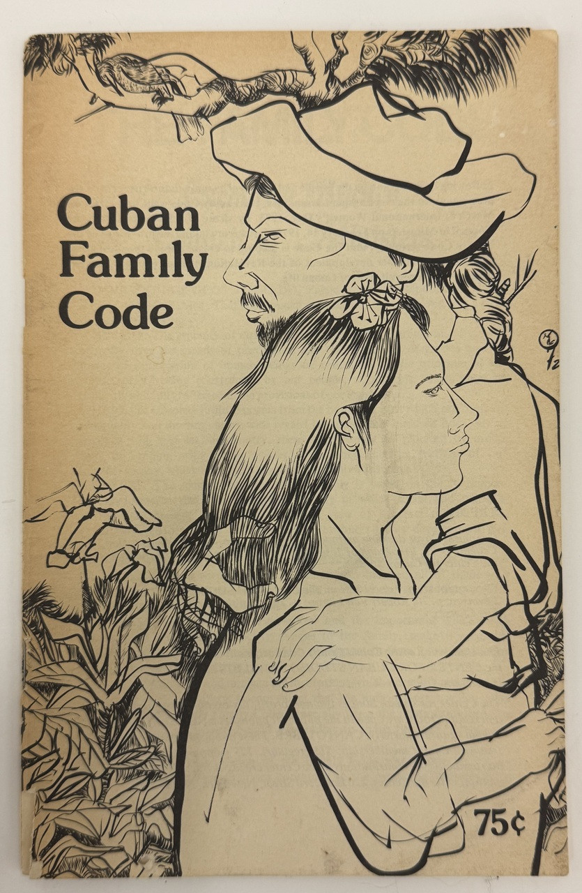 This English-language translation of Cuba's groundbreaking Family Code was published by the Center for Cuban Studies, a non-profit, tax-exempt institution based in New York City. The Cuban Family Code went into effect on March 8, International Women's Day, 1975, following public discussion and approval by more than 98 percent of participants in meetings and assemblies. The cover features an expressive line drawing by Cuban artist Nelson Dominguez depicting a Cuban family in a tropical setting, with additional interior illustrations including metal engravings on page 4 and photographs from Cuban film LUCIA and other Cuban archives. The Family Code represented a revolutionary advancement in equality between men and women in all areas of Cuban life, explicitly reflecting socialist principles by replacing obsolete bourgeois judicial norms with provisions based on equality and socialist concepts of family. This translation originally appeared in Volume II, Number 4 of the Center for Cuban Studies Newsletter and was made available as a standalone publication for 75 cents, helping to disseminate information about Cuba's progressive social legislation to English-speaking audiences during a period when US-Cuba relations remained strained.
