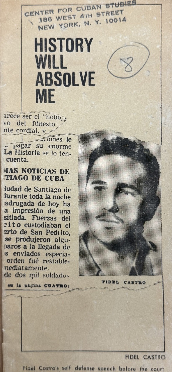 Comisión de Orientación Revolucionaria de la Dirección Nacional del PURSC (cover artist: unknown), "History Will Absolve Me / La historia me absolverá" by Fidel Castro, circa early 1960s, Offset print