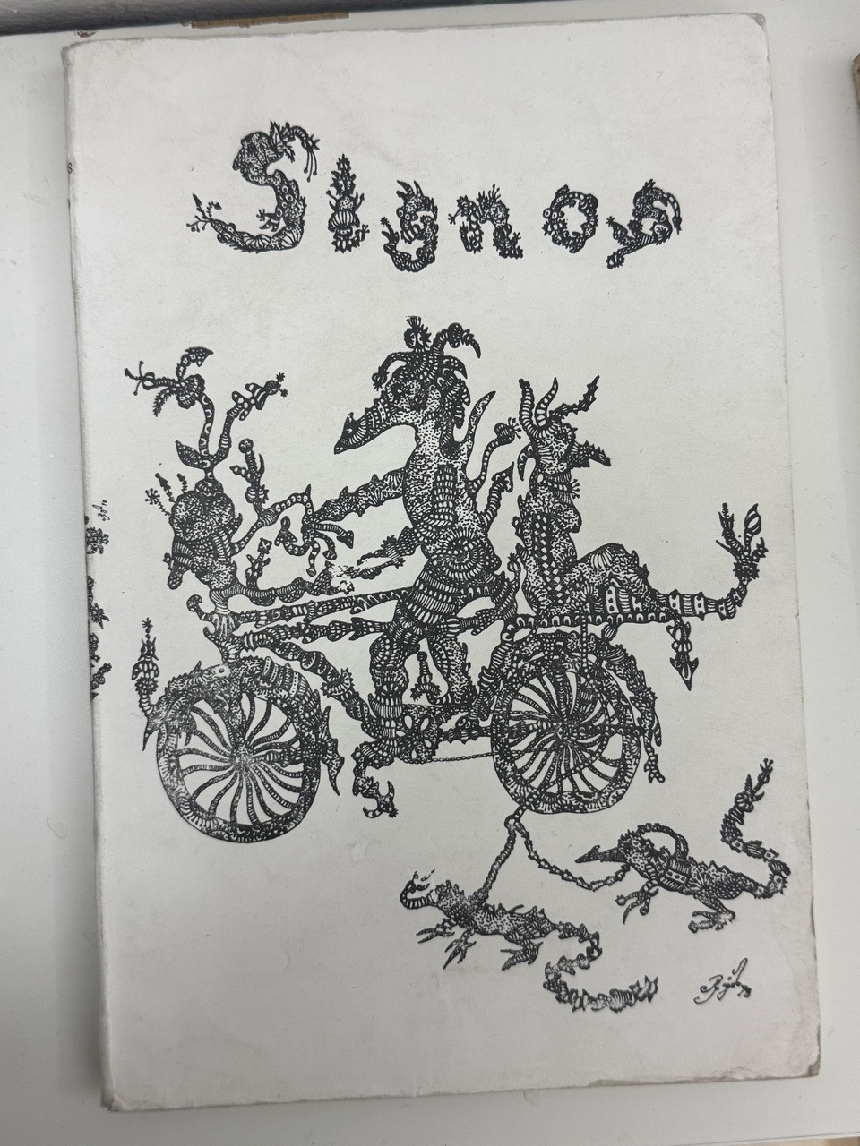 The hand-lettered masthead "Signos" appears in an organic, ornamental style that echoes the folk art aesthetic throughout the issue. Inside the magazine, additional artwork by Martínez demonstrates his mastery of the decorative folk art tradition: whimsical creatures, layered compositions, and imaginative figures all constructed through obsessive patterning and linear detail work. Like fellow folk artist Benjamín Duarte, Martínez was a self-taught artist whose work exemplified authentic popular artistic expression rooted in Cuba's rural communities.