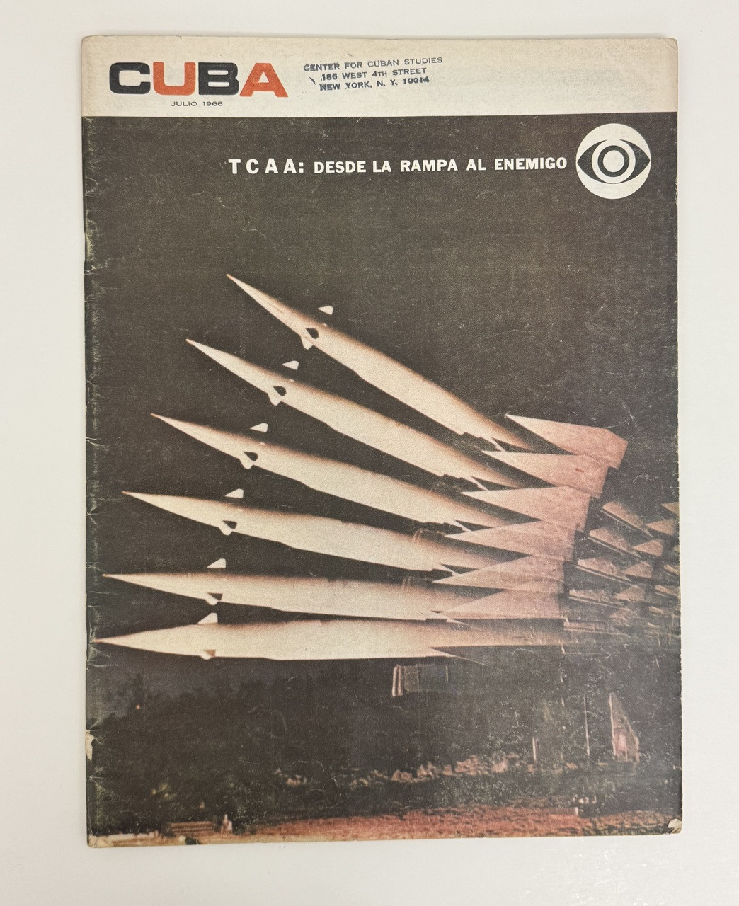 CUBA - Revista Mensual was a monthly magazine published from Havana serving as a vital communication channel for revolutionary Cuba to reach international audiences during the 1960s. This July 1966 issue features a stark, dramatic cover photograph of Soviet-made anti-aircraft missiles arranged in diagonal formation against a dark background, with the headline "TCAA: desde la rampa al enemigo" (Anti-Aircraft Artillery: From the Launch Ramp to the Enemy), emphasizing Cuba's military preparedness in the face of continued U.S. hostility.