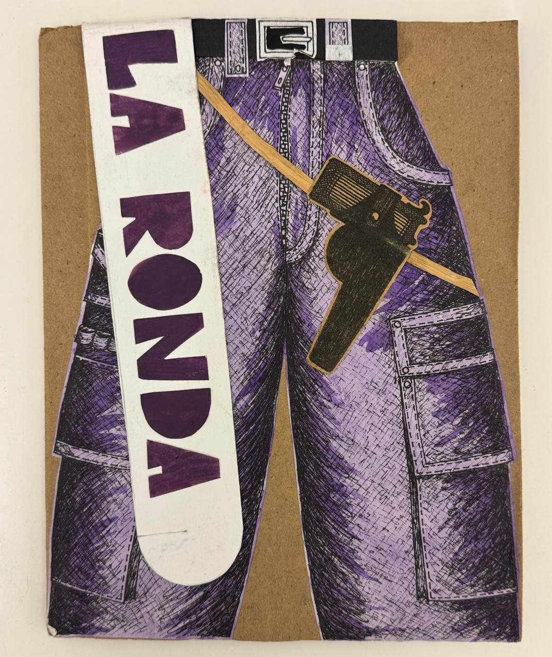 Rolando Estévez's provocative cover design for "La Ronda" features a bold visual metaphor that merges everyday clothing with implicit violence and sexuality. The composition depicts a pair of purple jeans rendered in meticulous crosshatch pen work, with detailed stitching, pockets, belt loops, and a prominent belt buckle. Tucked into the back pocket is a handgun drawn in black and brown, its barrel extending diagonally across the fabric. The title "LA RONDA" appears vertically along the left side in deep purple block letters on a white paper strip. The jeans are mounted on kraft cardboard backing, creating dimensional layering. Throughout the book's interior, Estévez varies this imagery—showing the jeans from behind on vibrant blue paper, depicting a female torso with purple corset-style lacing down the spine, and repeating the motif in different color combinations and perspectives.