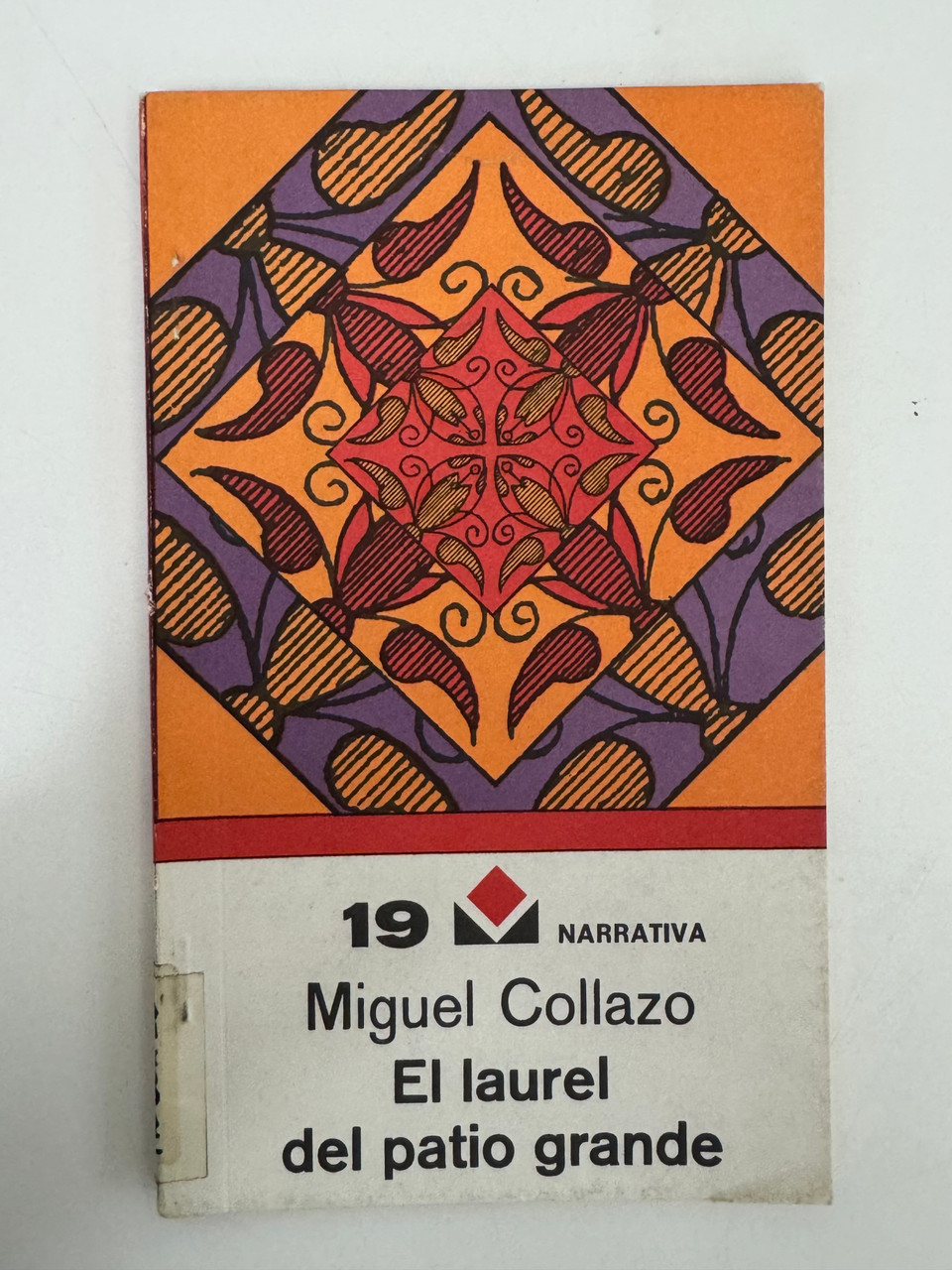The cover of "El laurel del patio grande" (The Laurel of the Grand Courtyard) features a striking geometric design by Raúl Martínez and Manuel Rodríguez, incorporating a traditional Cuban tile motif rendered in vibrant orange, purple, and red with intricate diagonal hatching. The diamond-shaped central pattern evokes colonial Spanish architecture and the iconic azulejo tiles found in Havana's historic courtyards, perfectly complementing the nostalgic themes of the narrative. The symmetrical design with its stylized birds and floral elements demonstrates the synthesis of Cuban decorative arts traditions with modern graphic design principles.
