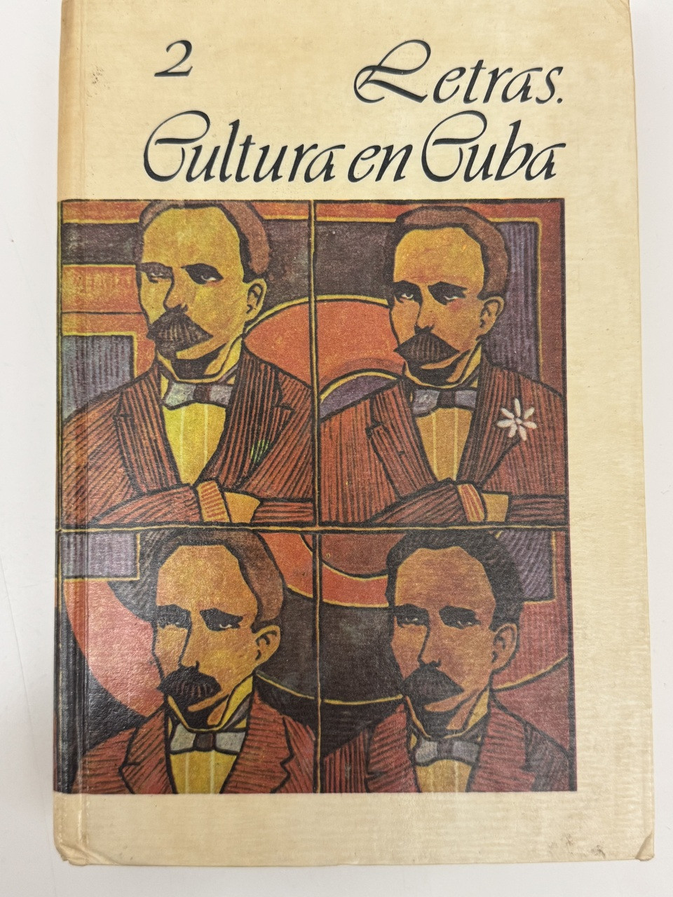 The cover of "2 Letras. Cultura en Cuba" features Raúl Martínez's celebrated pop art treatment "Martí y la flor" (Martí and the Flower), presenting four variations of José Martí's iconic portrait arranged in a 2x2 grid. Using vibrant warm tones of orange, yellow, red, and brown with distinctive linear hatching, Martínez transforms Cuba's national hero into a modernist icon that bridges 19th-century revolutionary ideals with 1960s-80s graphic aesthetics. The repeated image technique, reminiscent of Warhol's serial portraits, democratizes Martí's image while emphasizing his multifaceted legacy. Each portrait shows subtle variations in color and expression, suggesting the diverse interpretations of Martí's thought explored within the volume. This design exemplifies how revolutionary Cuba positioned Martí as both historical figure and living inspiration for contemporary socialist thought.