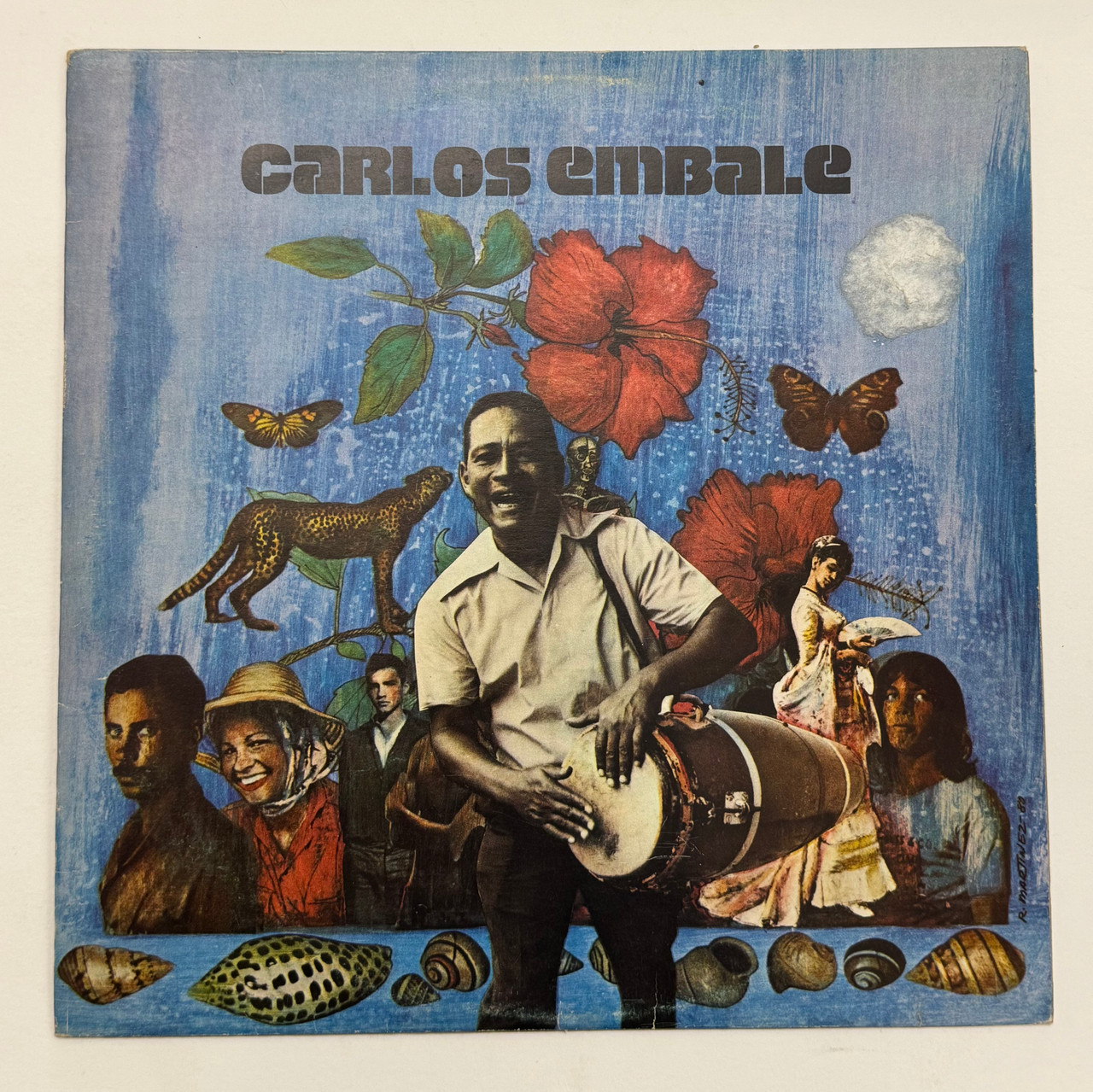 The cover presents Carlos Embale at center, holding a drum and surrounded by a rich tapestry of Cuban cultural symbols: vibrant red hibiscus flowers, butterflies, a spotted jaguar representing Cuba's natural heritage, decorative seashells along the bottom border, and multiple human figures including Afro-Cuban and white faces plus a traditional folkloric figure. The composition's textured blue background—created with visible brushstrokes—grounds this collage in Martínez's characteristic style, which drew from both international pop art and specifically Cuban visual traditions. A full moon in the upper right adds mystical dimension, referencing Afro-Cuban spiritual practices.