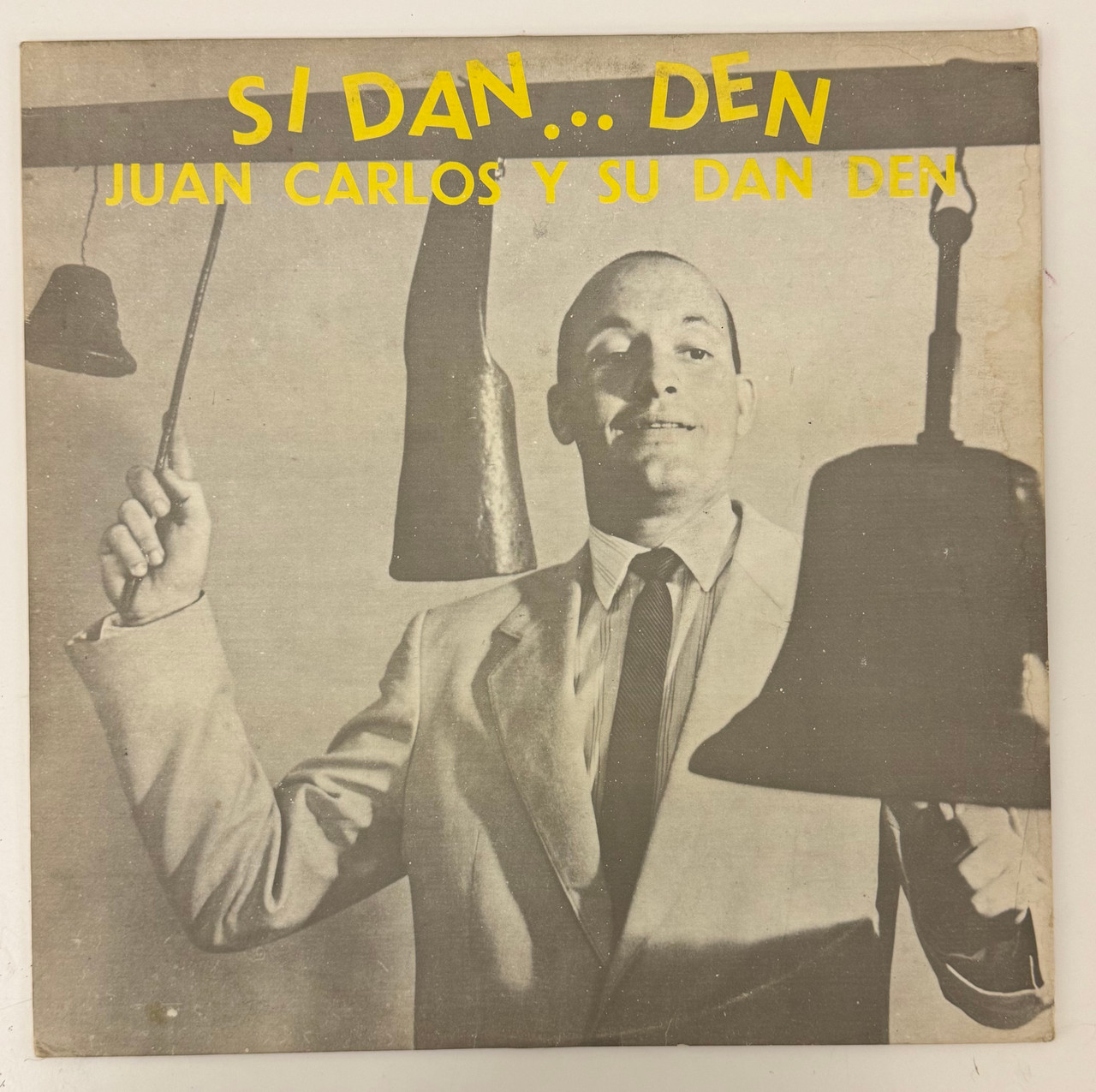 The cover design employs bold yellow hand-lettering over a dynamic black-and-white performance photograph, capturing bandleader Juan Carlos Alfonso mid-performance with drumsticks raised. This energetic image reflects the explosive popularity of Cuban dance music in the 1980s. The typography's playful arrangement of "SI DAN... DEN" creates visual rhythm that mirrors the album's infectious salsa and timba grooves.