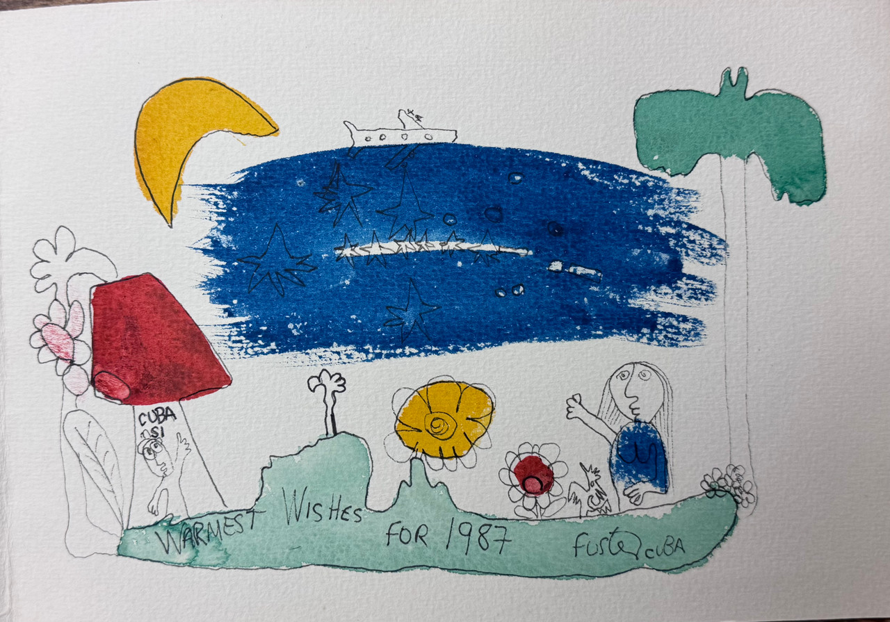 Fuster (José Rodríguez Fuster), Untitled, Dedicated to the Center for Cuban Studies, 1987. Mixed media: ink and watercolor on paper. 7" × 10". #725B NFS
