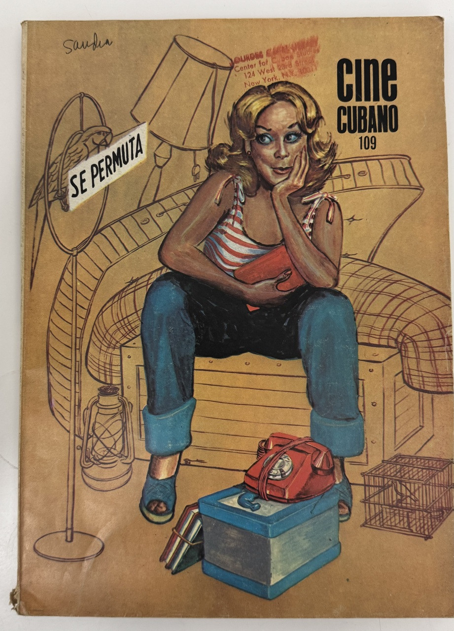 Directed by Julio García Espinosa and edited by Luis Rogelio Nogueras, this issue includes diverse content: articles on 25 years of Cuban cinematography, profiles of filmmakers like Saúl (the "indomitable optimist"), poetry by Rafael Alberti, analyses of Chilean cinema in exile (1973-1983), and examinations of Montiel's widow and the lost hunters of the Arca region. The choice of Rosita Fornés for the cover—a performer who bridged pre- and post-revolutionary Cuban entertainment—represents continuity in Cuban popular culture while the surrounding "permuta" objects suggest the resourcefulness and material realities of revolutionary life. This issue captures Cuban cinema at a moment of mature reflection, looking back on a quarter-century of revolutionary filmmaking.