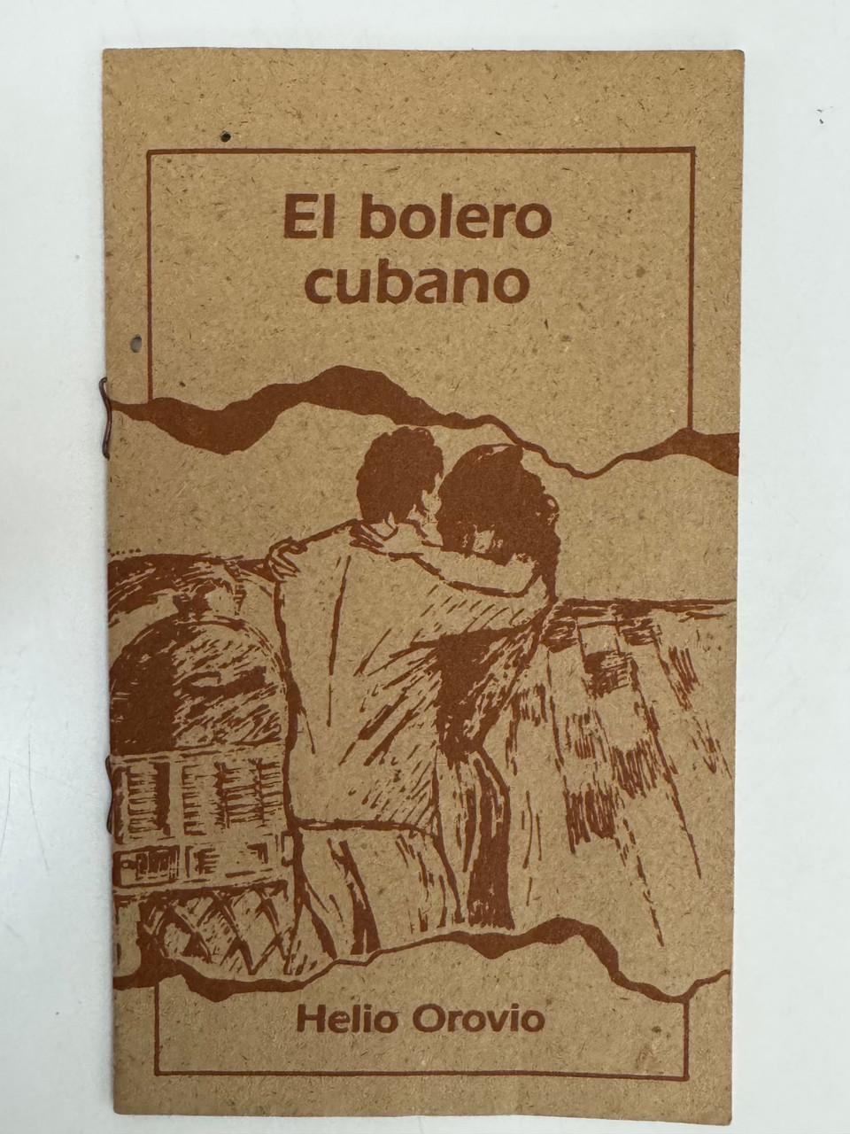 The cover of "El bolero cubano" features an evocative brown-on-kraft-paper illustration depicting two figures in an intimate embrace beside a jukebox, framed by flowing decorative borders that echo the romantic, lyrical quality of the bolero itself. The monochromatic design by Marta Mosquera evokes nostalgia for the golden age of Cuban popular music, with its sketchy, expressive linework suggesting both movement and emotion. The back cover continues this aesthetic with an illustration of a traditional Cuban percussion instrument, reinforcing the book's focus on musical heritage. The earthy, unbleached paper stock and simple two-color printing reflect the material constraints of Cuba's Special Period in the 1990s while maintaining an elegant, understated design that complements the scholarly yet accessible nature of the text.