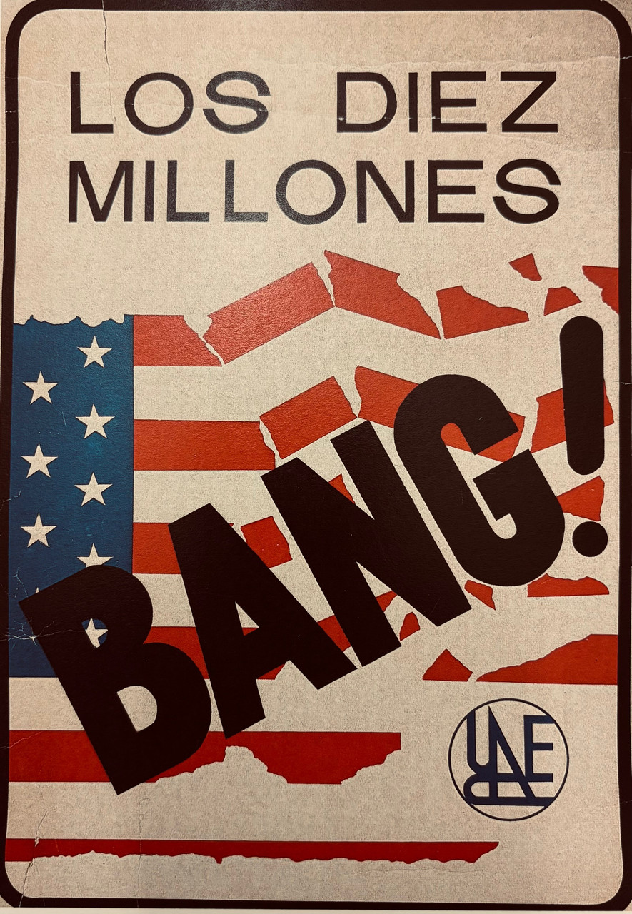 "LOS DIEZ MILLONES" (The Ten Million) at the top and a bold "BANG!" across the fractured stars and stripes, created as anti-American political commentary.