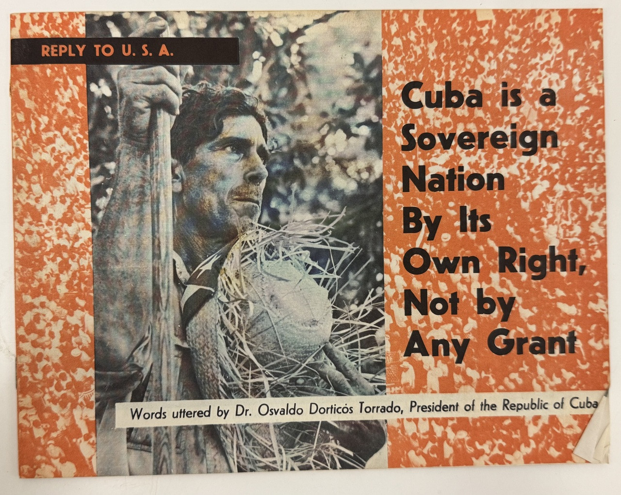 This significant diplomatic propaganda publication was issued by Cuba's Ministry of Foreign Relations during the "Year of the Land Reform" (1959-1960), documenting President Osvaldo Dorticós Torrado's response to U.S. President Dwight D. Eisenhower on January 27, 1960. The striking cover design features bold orange and black typography with a powerful photograph of a Cuban peasant or agricultural worker, embodying the revolutionary government's assertion of sovereignty rooted in popular support. The back cover continues the orange theme with imagery of agricultural machinery, reinforcing the land reform message central to the revolution's legitimacy. Interior photographs show President Dorticós at a formal diplomatic response, with Minister of Foreign Relations Dr. Raúl Roa present, demonstrating the government's sophisticated approach to international relations. Published during a critical period when Cuban-American relations were rapidly deteriorating, this booklet represents the revolutionary government's mastery of visual propaganda and diplomatic messaging, combining modernist graphic design with photographs that humanize the revolution while asserting Cuba's determination to remain "fully conscious of its sovereignty" and reject any "interventionist policy whatsoever." The publication's bilingual approach and professional production values demonstrate Cuba's early commitment to international public relations in the global Cold War struggle.