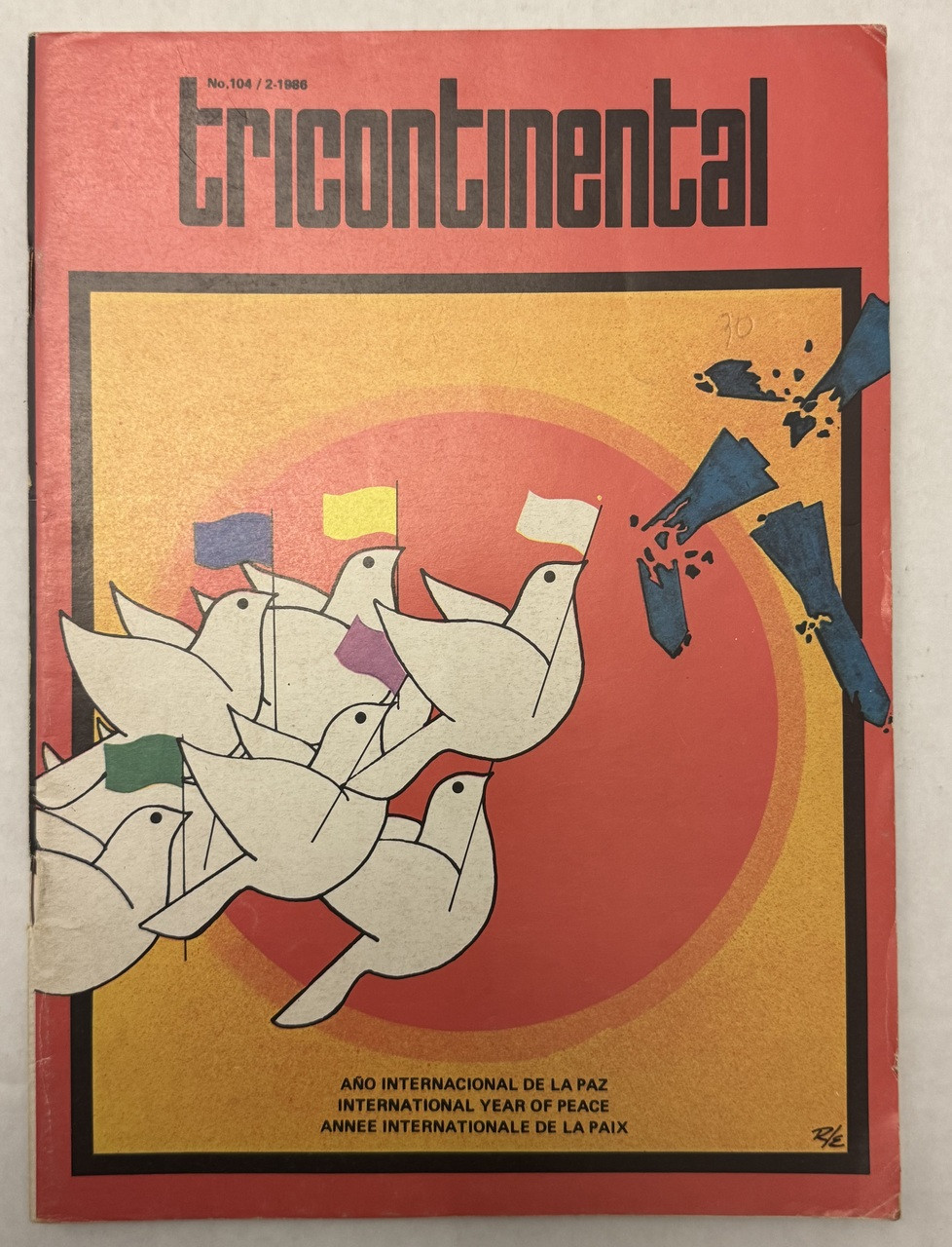 This 1986 issue demonstrates how OSPAAAL continued linking peace advocacy with anti-imperialist struggle, arguing that genuine peace required not just absence of war but elimination of the structural violence of debt, neocolonialism, and military intervention that kept the Third World subjugated. Enríquez's optimistic design perfectly captures this message—peace doves carrying the flags of liberation movements triumphantly overcoming the forces of militarism and imperialism.