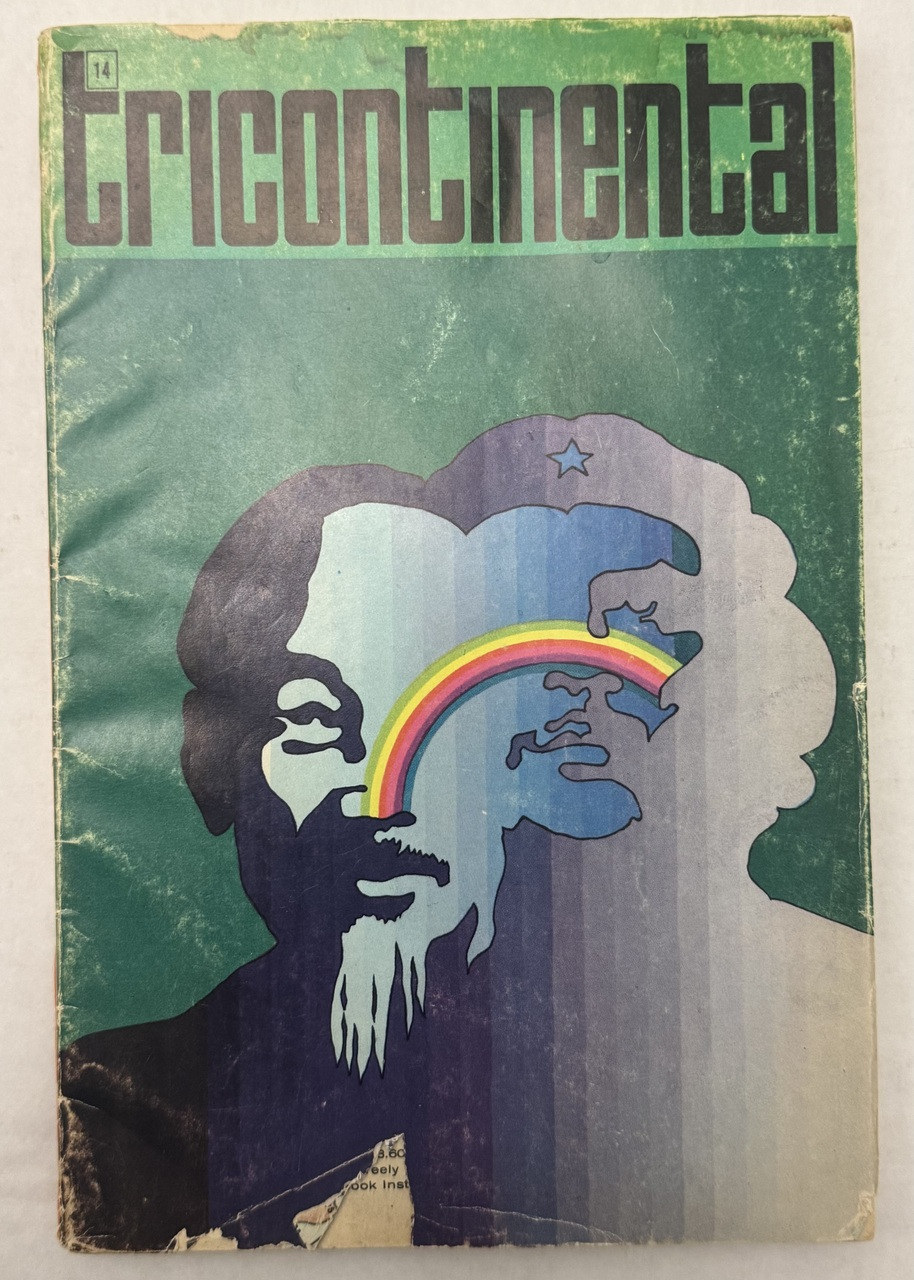 Published just weeks after Ho Chi Minh's death in September 1969, Tricontinental No. 14 commemorates the second anniversary of the Battle of the Yuro gorge where Che Guevara was captured in Bolivia. The cover presents a poetic visual metaphor: overlapping silhouette profiles showing Che Guevara's distinctive bearded visage merged with a blue globe depicting the world map, connected by a vivid rainbow arc and topped with a single star. The design employs graduated color fields in sage green, turquoise, deep purple, and cream, creating a dreamlike quality that transforms both revolutionary leaders into universal symbols of international solidarity.