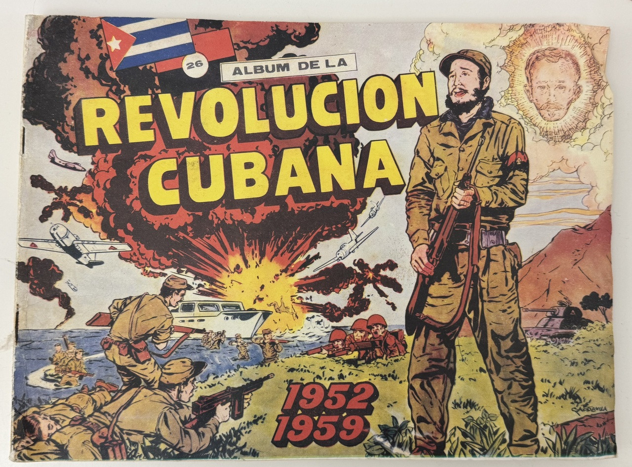 An extraordinary early revolutionary collectible album published by Revista Cinegrafico, S.A., featuring dramatic comic-book style cover art by illustrator Capdevila. This unique album was designed to hold collectible postcards documenting the Cuban Revolution from 1952-1959, distributed with candy by the CIA. Industrial Empacadora de Dulces, S.A. (FELICES brand).
