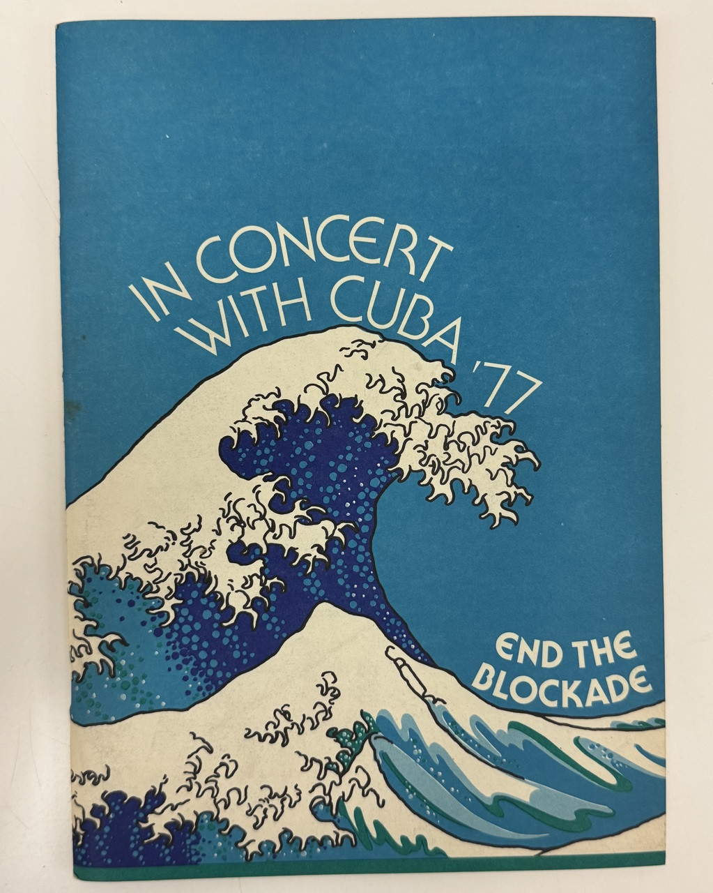 "In Concert with Cuba '77: End the Blockade" commemorated the 24th anniversary of the July 26, 1953 attack on the Moncada Barracks, which sparked the Cuban Revolution. The program's cover brilliantly appropriates Hokusai's iconic "Great Wave off Kanagawa," reimagining the cresting wave in shades of turquoise and navy blue against a vibrant sky—visual metaphor for the powerful momentum of solidarity movements working to "END THE BLOCKADE." This creative recontextualization of Japanese woodblock aesthetics connected international artistic traditions with anti-imperialist politics, suggesting that movements for liberation, like ocean waves, possess unstoppable force.