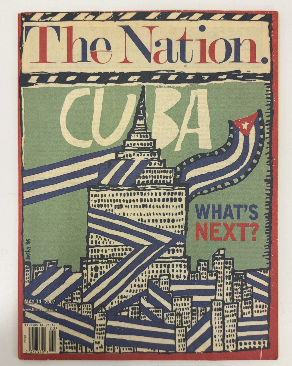 Published during a critical juncture when Fidel Castro's illness had prompted succession to his brother Raúl, and as U.S. political actors began reconsidering the "dumbest policy on the face of the earth," The Nation devoted this issue to arguing for normalization of relations. The editorial "Changing Course on Cuba" advocates lifting the embargo, noting growing bipartisan support for policy change. By featuring Muñoz Bachs's artwork from the Center for Cuban Studies Collection, the magazine positioned Cuban visual culture as worthy of mainstream American progressive attention, demonstrating how Cuban graphic design continued to shape international representations of the island. The cover's sophisticated aesthetic—combining Muñoz Bachs's distinctive style with contemporary design by Avenging Angels—illustrated how Cuban revolutionary graphics influenced solidarity movements and progressive media in the United States decades after their creation.