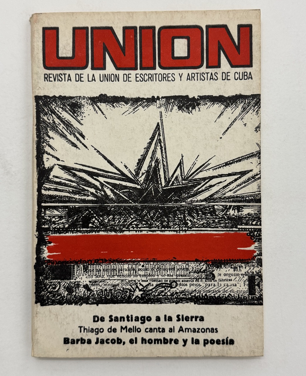 This issue of UNIÓN features powerful Latin American literary voices, with a particular focus on revolutionary landscapes and the Amazon region. The cover, designed by renowned poet and artist Fayad Jamís, employs bold woodcut-style illustration depicting explosive palm or agave plants rendered in dramatic black ink with energetic diagonal hatching. A striking red horizontal band cuts across the composition, creating visual tension between the organic forms above and text below, evoking both tropical vegetation and revolutionary fervor.