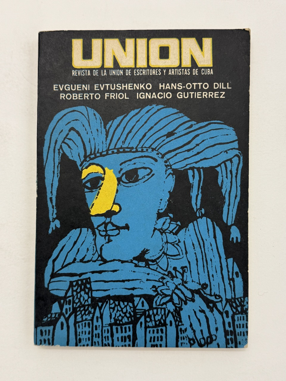This issue of UNIÓN showcases the magazine's commitment to international socialist literary solidarity alongside Cuban voices during a critical period of Cold War tensions. The cover, designed by the celebrated Cuban poster artist Muñoz Bachs, features a powerful expressionist illustration rendered in vibrant turquoise and yellow against a deep black background. The stylized figure with flowing hair hovers above a simplified urban skyline, creating a dreamlike composition that merges human consciousness with the built environment in a distinctly modernist aesthetic.
