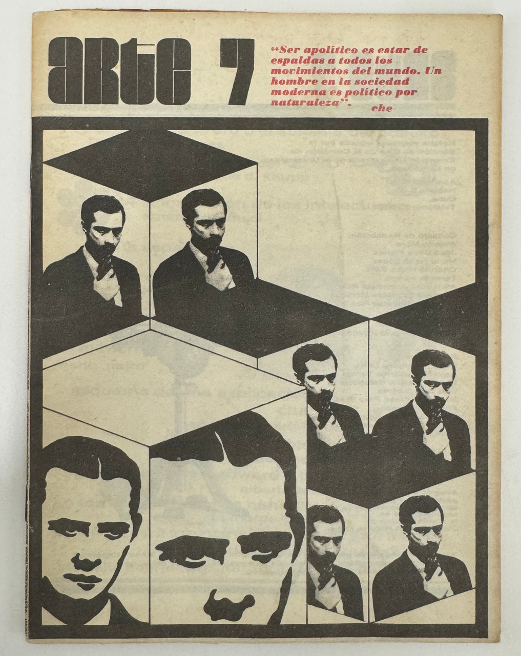 arte 7 was a monthly magazine published by the Cinema Commission of the University Extension of the University of Havana, dedicated to the dissemination of cinematographic materials within the university environment. The magazine's editorial board included Alberto Mora, José Doce Fleitas, Mario Naito López, Orlando Rojas Félix, Teresita Huerta, Alejandro Armengol Ríos, Eugenio Espinosa Martínez, and Bernardo Callejas Ríos. Issue No. 11 features a striking cover design by artistic director Luis G. Fresquet (known as "Chamaco") that demonstrates sophisticated understanding of op-art and geometric modernist principles. The cover employs an isometric cube construction filled with repeated high-contrast portrait photographs, creating a tessellating pattern that suggests both multiplication and surveillance. The portraits appear to reference historical political figures, arranged in a visual puzzle that invites contemplation of identity, repetition, and political consciousness.